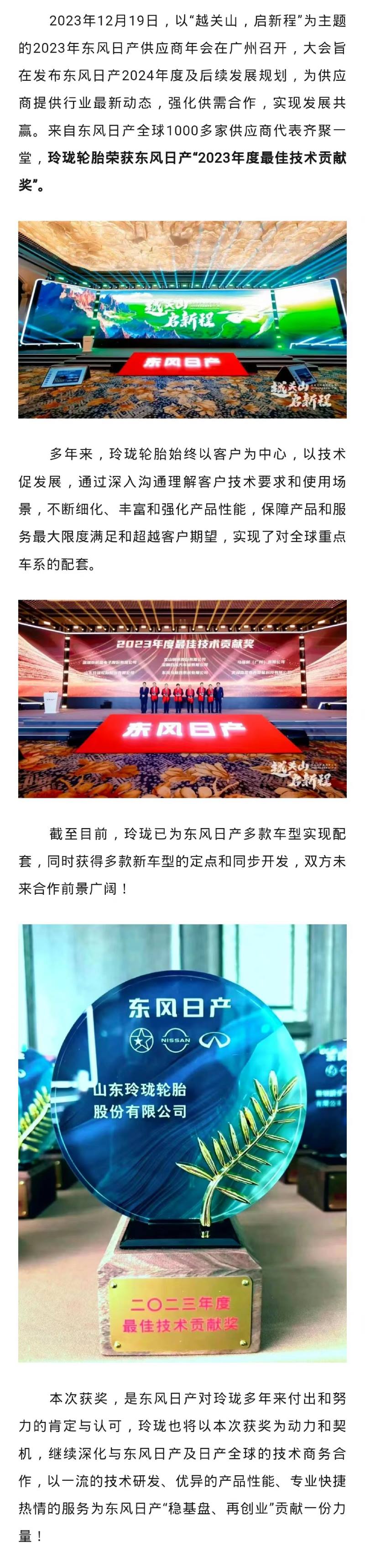 玲珑轮胎获东风日产“最佳技术贡献奖”