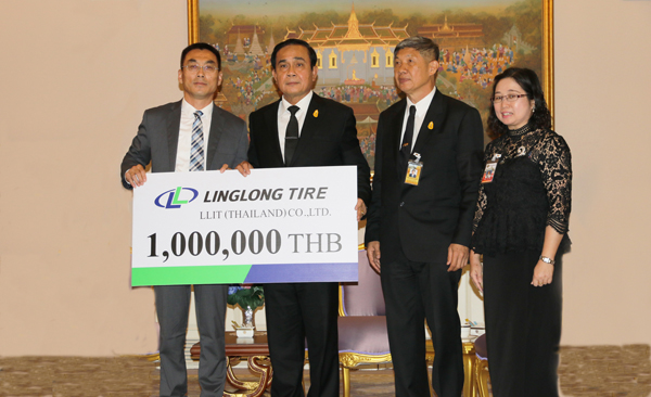 2017年2月3日,在泰国总理府,玲珑国际轮胎(泰国)有限公司参加了泰国总理巴育主持的“民众齐心,助南部灾区”爱心捐款新闻发布会,巴育总理亲自接见玲珑轮胎代表刘占东,并亲手接过泰国玲珑捐助善款100万泰铢。