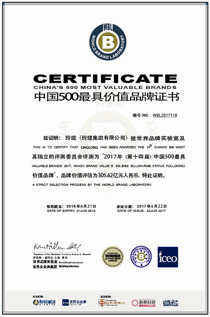 6月22日,由世界品牌实验室(World Brand Lab)主办的第十四届“世界品牌大会”在北京举行,会上发布了2017年《中国500最具价值品牌》报告。“玲珑”品牌以305.62亿元品牌价值,第十三次荣登榜单,位列第119位。