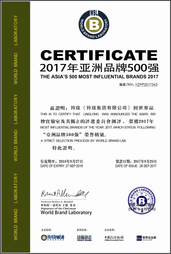 近日,由世界品牌实验室和世界经理人集团共同编制和发布的2017年《亚洲品牌500强》排行榜在香港揭晓,共有20个国家和地区的500个品牌入选,玲珑品牌强势入围“2017年亚洲品牌500强”。