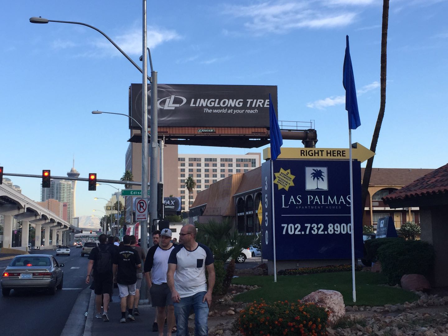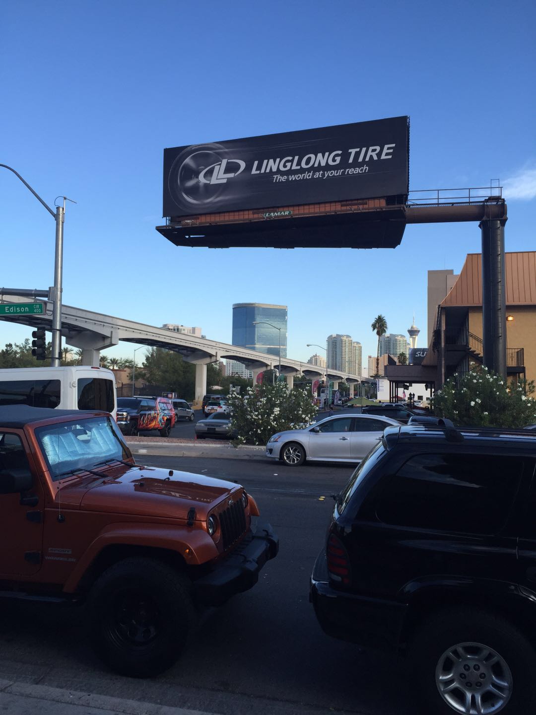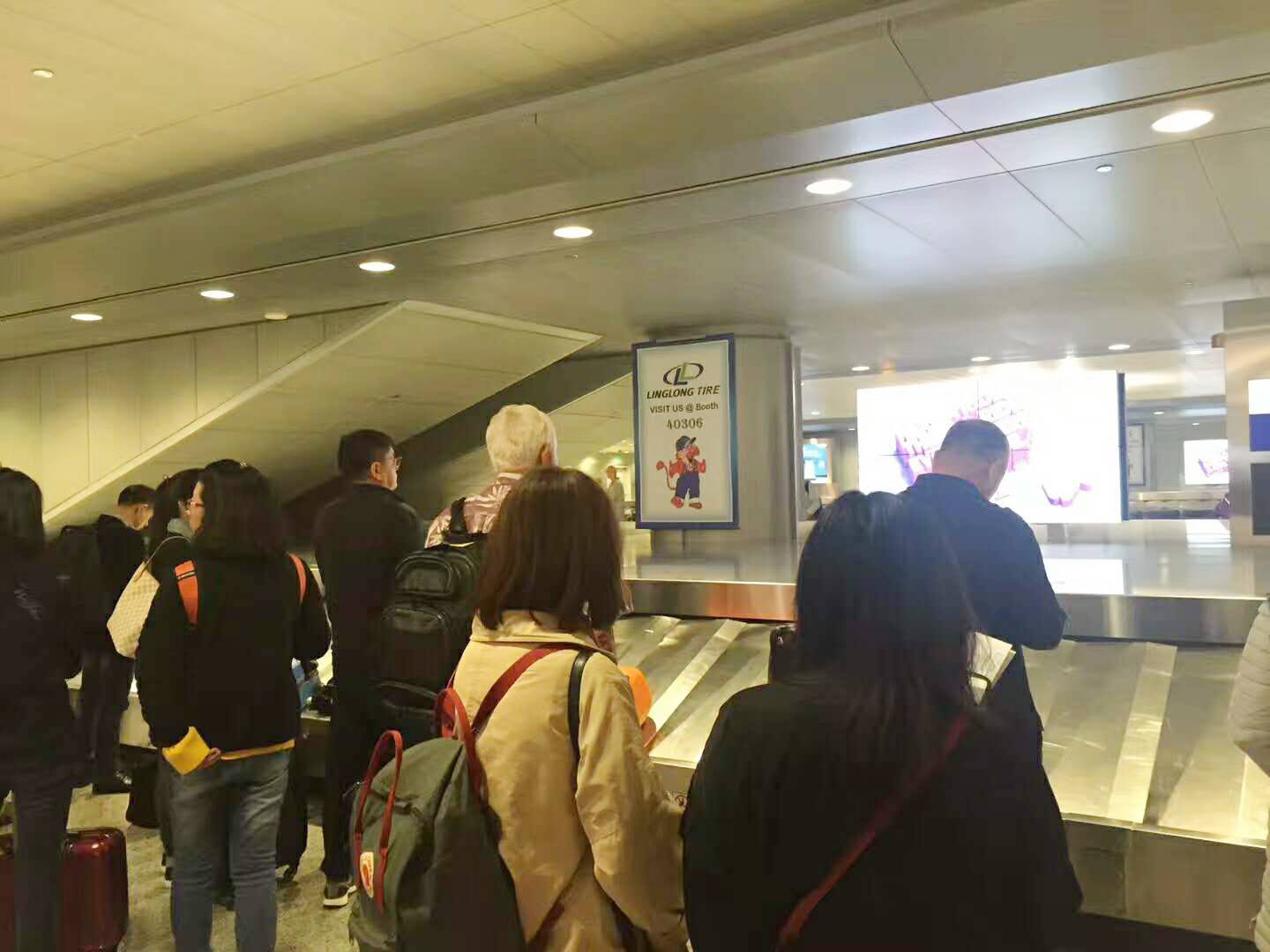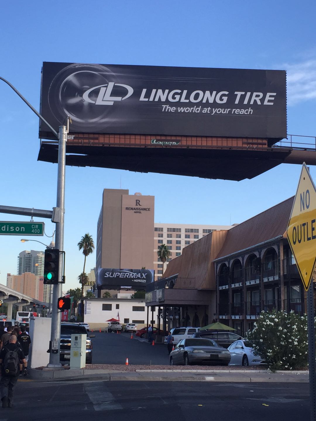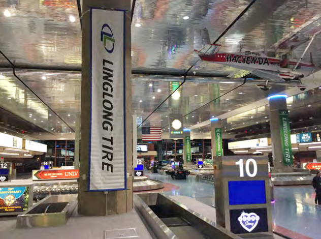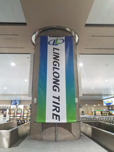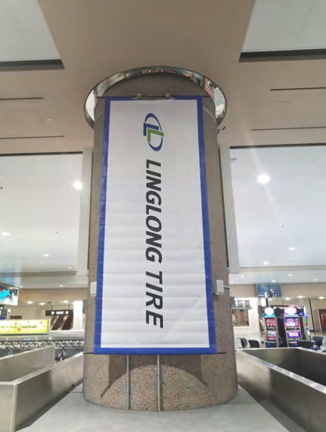 一下飞机,来到行李领取处,首先映入眼帘的便是玲珑轮胎的欢迎牌。欢迎牌上玲珑轮胎的吉祥物利奥小子,不仅表示了对游客的欢迎,还向游客们发出邀请,到访玲珑轮胎SEMA展位(展位号:40306)。 再往外走,玲珑轮胎的条幅随处可见,让人感觉整个机场的欢迎牌都被玲珑承包了。 走出机场,在去展馆的路上,目光再一次被玲珑轮胎的户外大牌广告所吸引,不禁让人赞叹玲珑强势的品牌宣传力度。