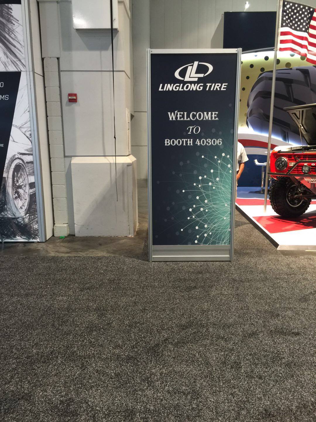 来到展馆内后,玲珑轮胎各种人性化的指引,可以让访客们轻松找到玲珑轮胎的展位。 顺着指引地标,来到了玲珑轮胎此次SEMA展位,终于见到了“庐山真面目”。