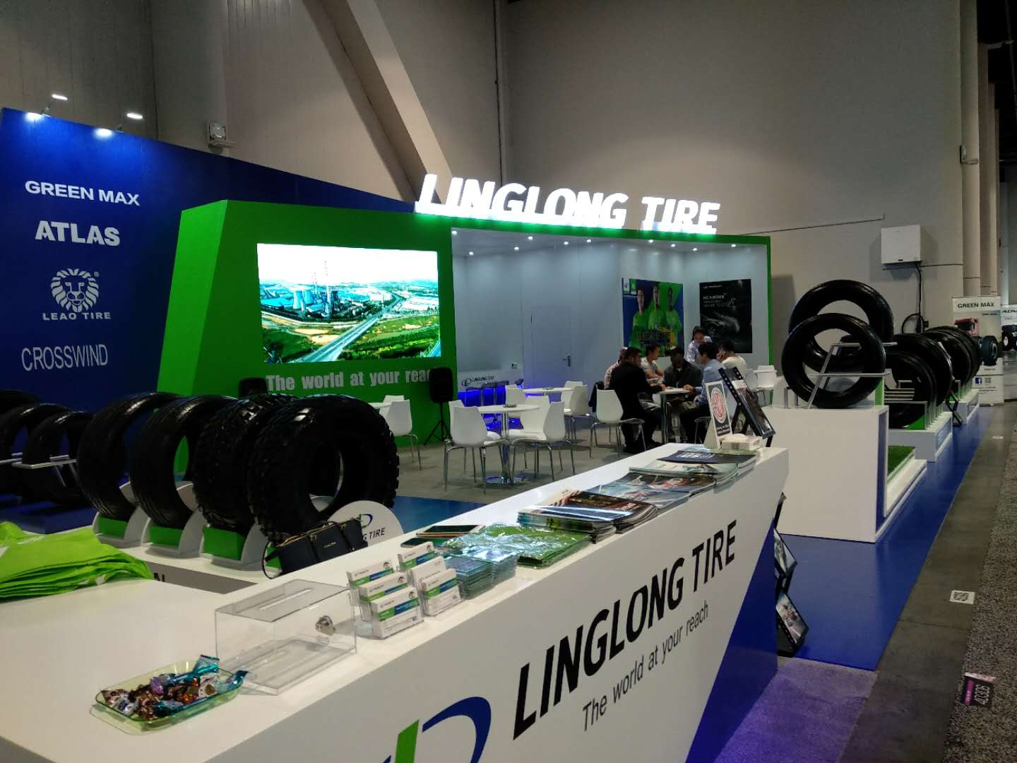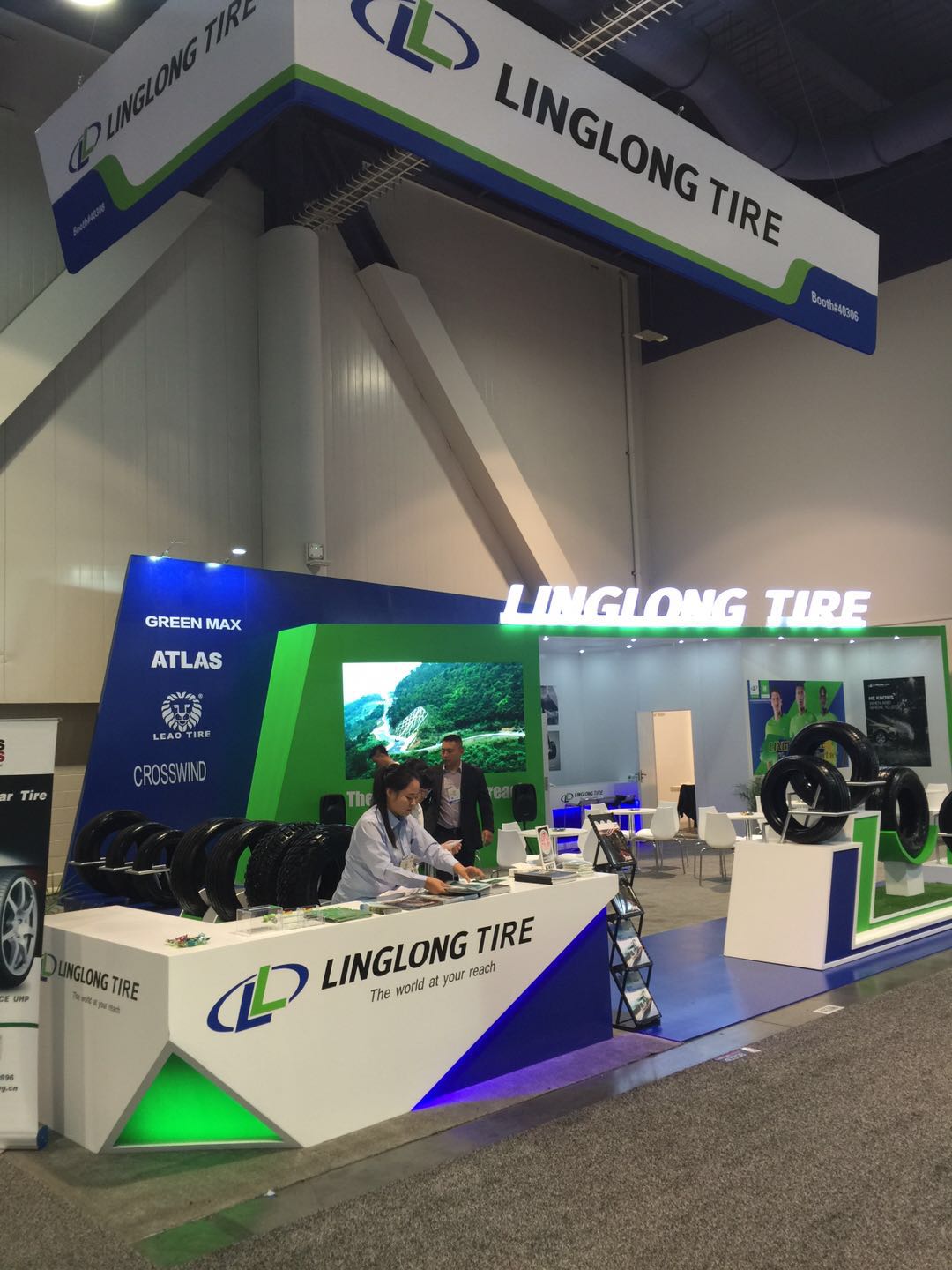 玲珑此次展示的轮胎主要以玲珑、利奥、ATLAS以及 GREEN MAX 四个品牌为主,共计展示22条轮胎,包括半钢轮胎、全钢轮胎、斜交农业胎以及实心胎。以ATLAS FORCE HP 和 FORCE UHP 为代表的半钢轮胎,和以GREEN MAX GDH100以及GDH102为代表的全钢轮胎,均为玲珑轮胎北美市场主推的产品,吸引了不少现场的访客。