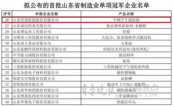 首批山东省制造业单项冠军企业名单公布,玲珑轮胎获“半钢子午线轮胎”单项冠军!