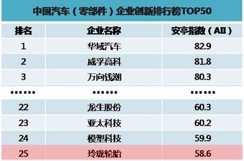 玲珑轮胎入选中国汽车(零部件)企业创新排行榜50强