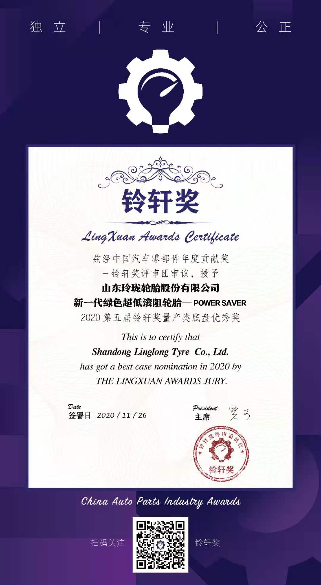 11月26日,2020中国汽车供应链峰会暨第五届铃轩奖典礼在武汉召开。玲珑新一代绿色低滚阻轮胎POWER SAVER获得“量产类底盘优秀奖”,成为唯一获奖的轮胎企业。