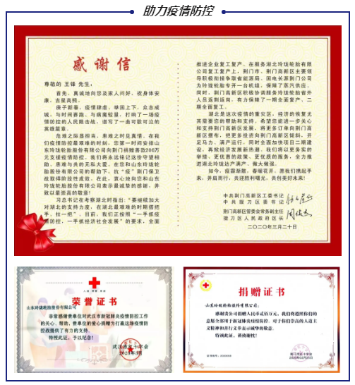 2020年1月26日开始,玲珑轮胎陆续向武汉、荆门红十字会捐赠500万元支援疫情防控;为火神山医院建设车辆提供免费轮胎救援服务;在2020年2月疫情最严重时增发20亿用于湖北玲珑项目建设。危难之际,彰显大企风范,收到了来自武汉、荆门多方发来的荣誉证书和感谢信。