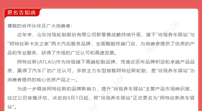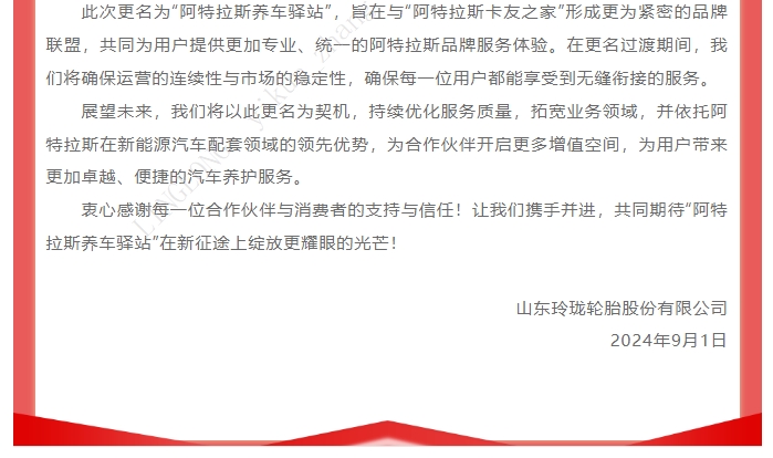 名称虽改,初心不变丨“玲珑养车驿站”更名为“阿特拉斯养车驿站”的告知函